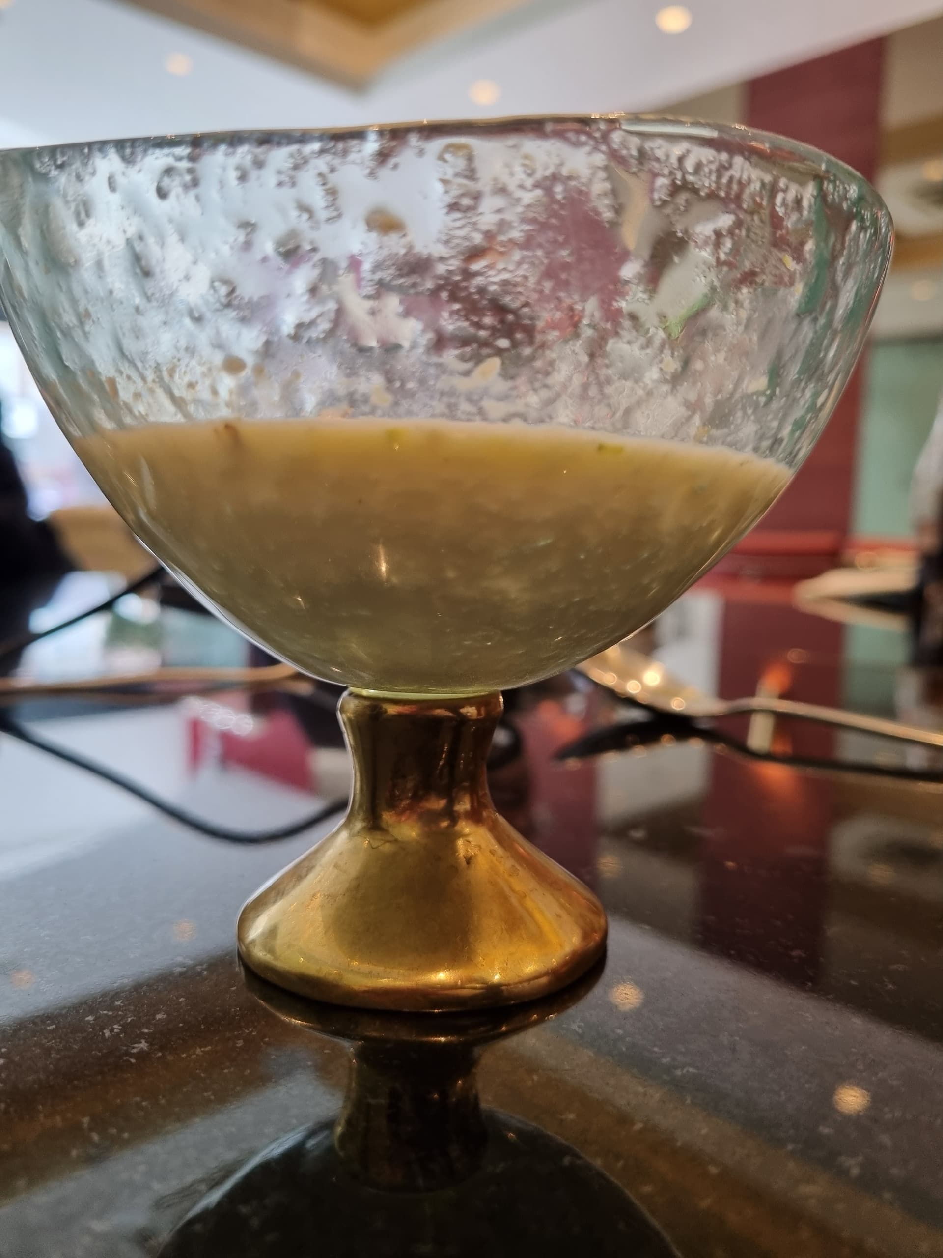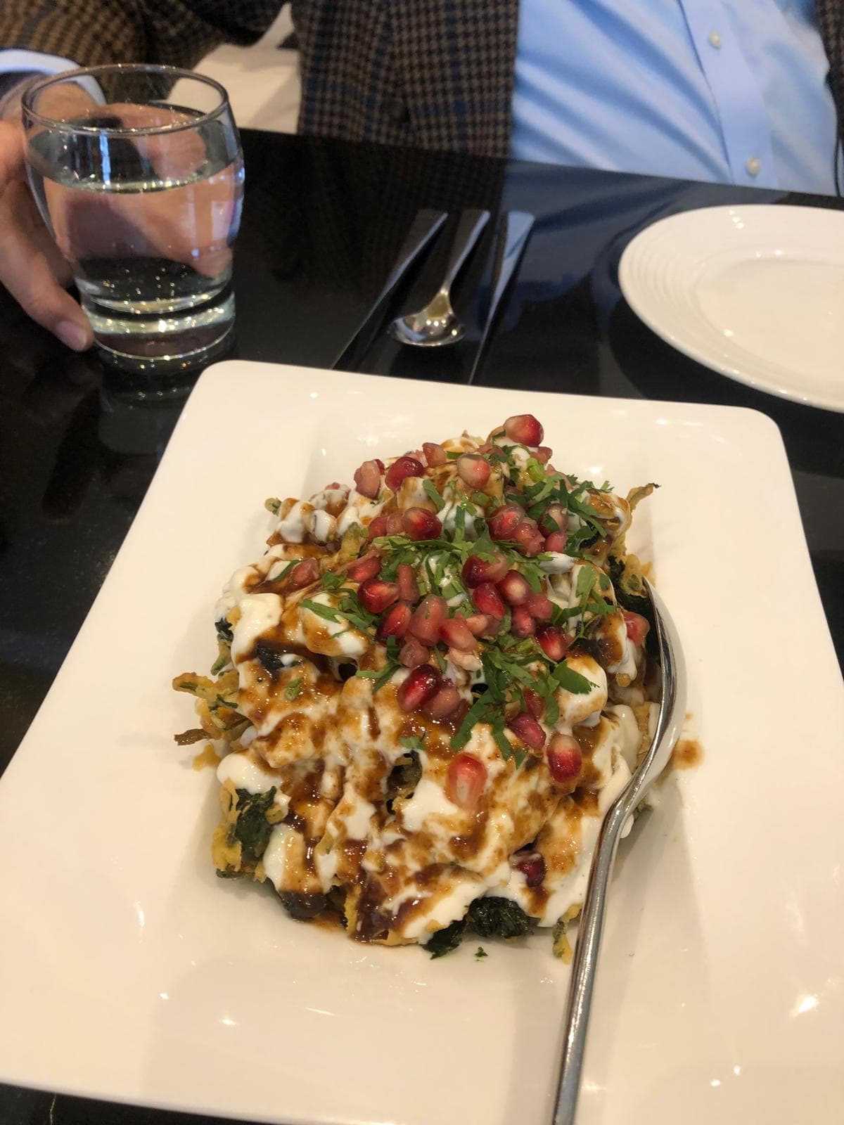 Palak Patta Chaat: green leaves, marinated with chilli, turmeric & fresh coriander, coated in chickpea batter and drizzled with yoghurt & tamarind.