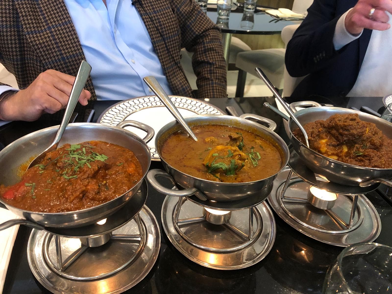 Main courses of masala macchi (fish), bhuna prawn, and jeera chicken