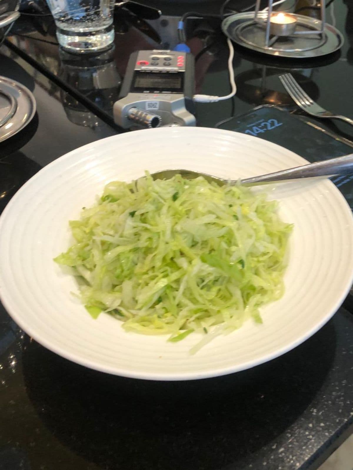 Sanjay’s own salad of shredded lettuce, lemon, salt and green chillies.